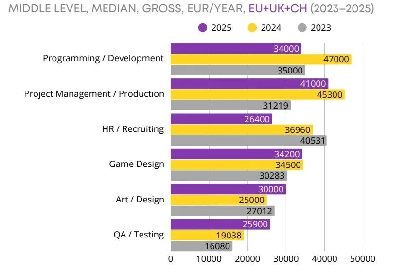 大型游戏行业就业调查显示,从薪资中位数来看,欧盟和非欧盟国家在所有职位和资历方面仍然存在持续的差异。
