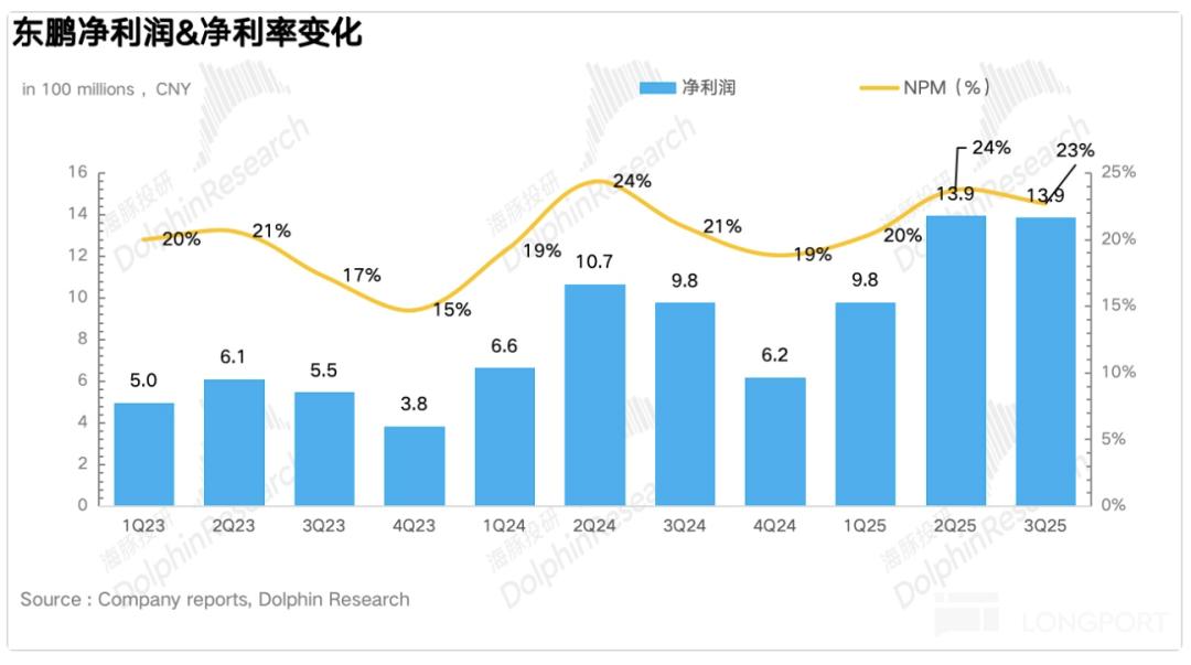 利润端,由于东鹏二季度费用投放的前置叠加整体公司经营杠杆的释放,3Q25 东鹏实现利润 13.9 亿元,同比增长 41.8%,仍然快于营收端的增长,整体的业绩质量还是比较高的。