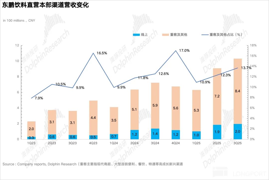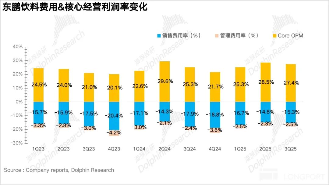当前阶段市场显然更关心的是东鹏的 “第二增长曲线” 电解质水的增长情况。3Q25 电解质饮料实现营收 13.5 亿元,同比增长 84%,从趋势上看,经过连续四个季度 200% 以上的高速增长后,环比增速虽然有所下滑,但依然维持了比较高的增长。
