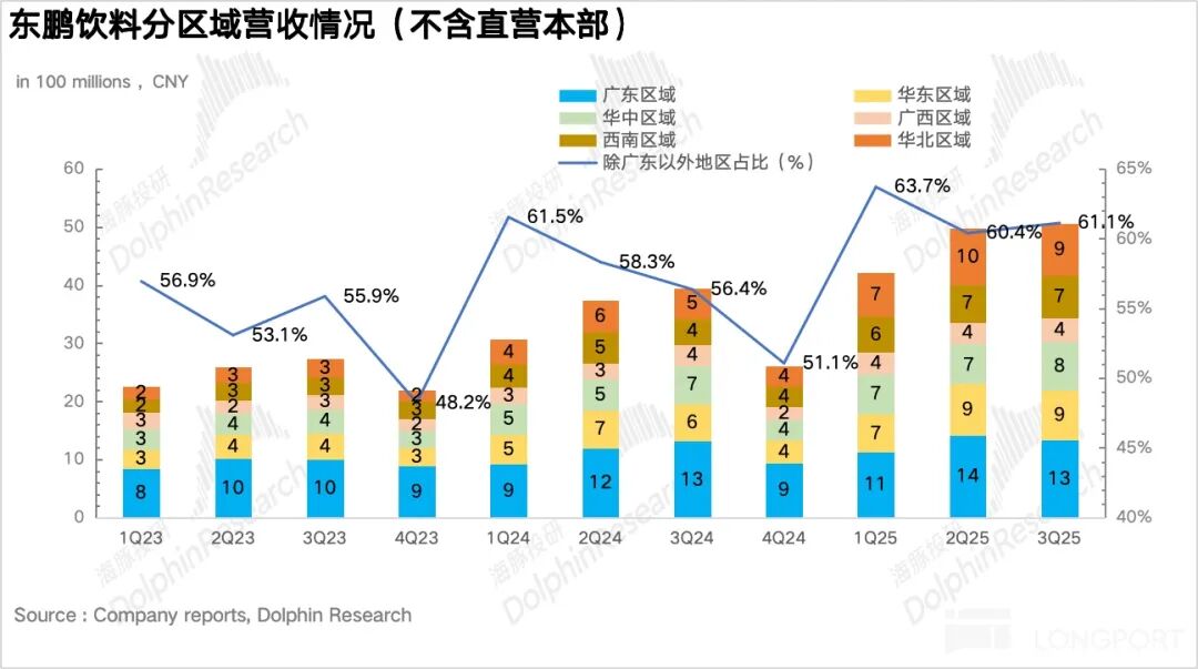 3.基地市场已经接近天花板。分区域来看,虽然除广东以外的其他地区仍然保持了 42% 高于大盘增速的增长,但最大的问题在于东鹏的大本营广东地区经过持续多年的深耕,三季度仅同比增长 2%。