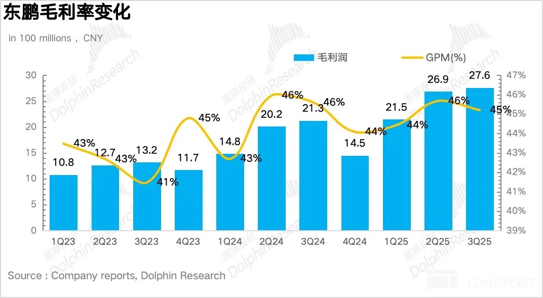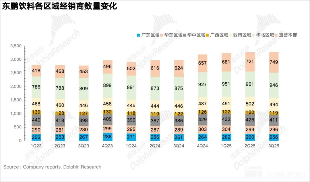 2.能量饮料持续降速:分品类看,3Q25 东鹏能量饮料实现营收 42 亿元,同比增长 15%,从趋势上看环比二季度持续降速,单季度增速处于近 3 年以来最低水平,核心还是在于海豚君此前强调的随着东鹏特饮的持续增长,整体的体量已经越来越接近天花板。