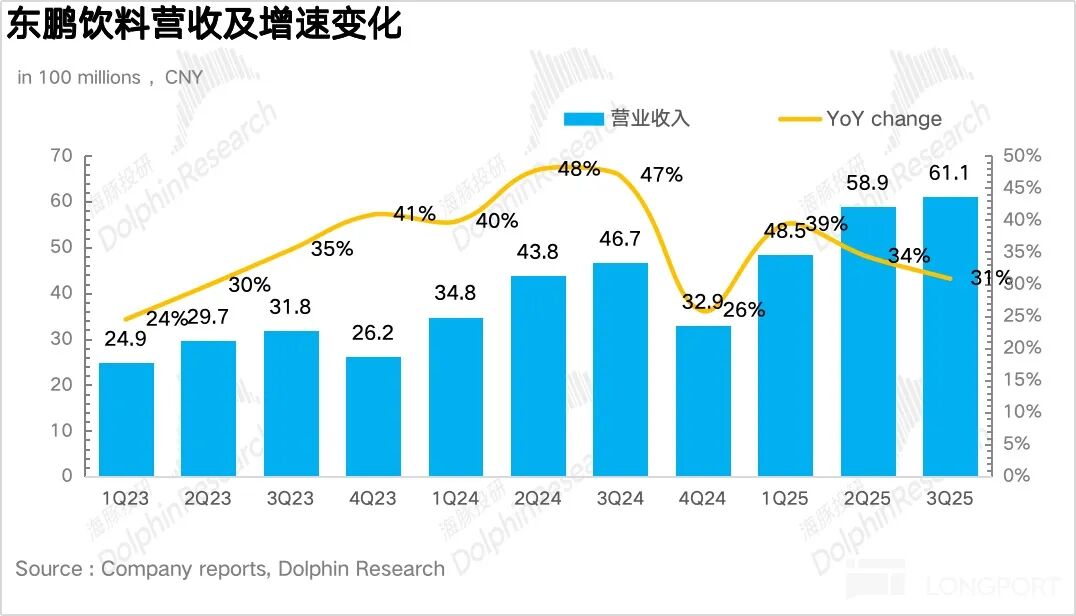 1.营收小幅不及市场预期:3Q25 东鹏饮料实现总营收 61.1 亿元,同比增长 30.8%,从趋势上看环比前两个季度有所降速。