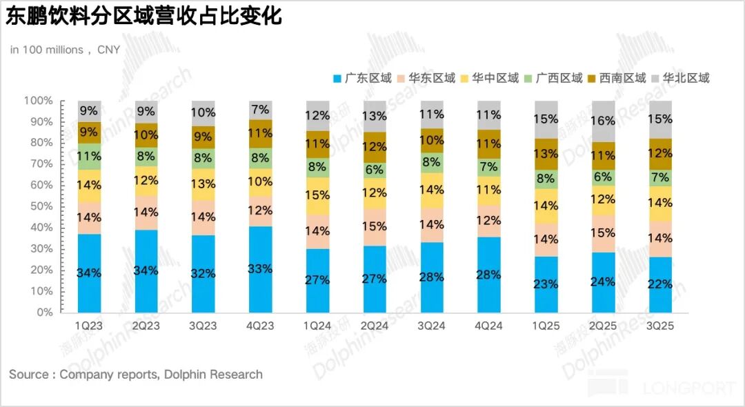 如果把时间线推到 3 年前,彼时华北地区还是东鹏最为薄弱的环节,营收仅为 6 亿元,占比不足 7%。
