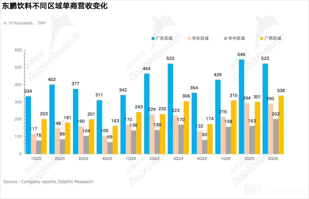 从海豚君测算得到的广东地区单商营收来看,三季度也没有了增长,说明东鹏的基地市场基本已经接近增长天花板。