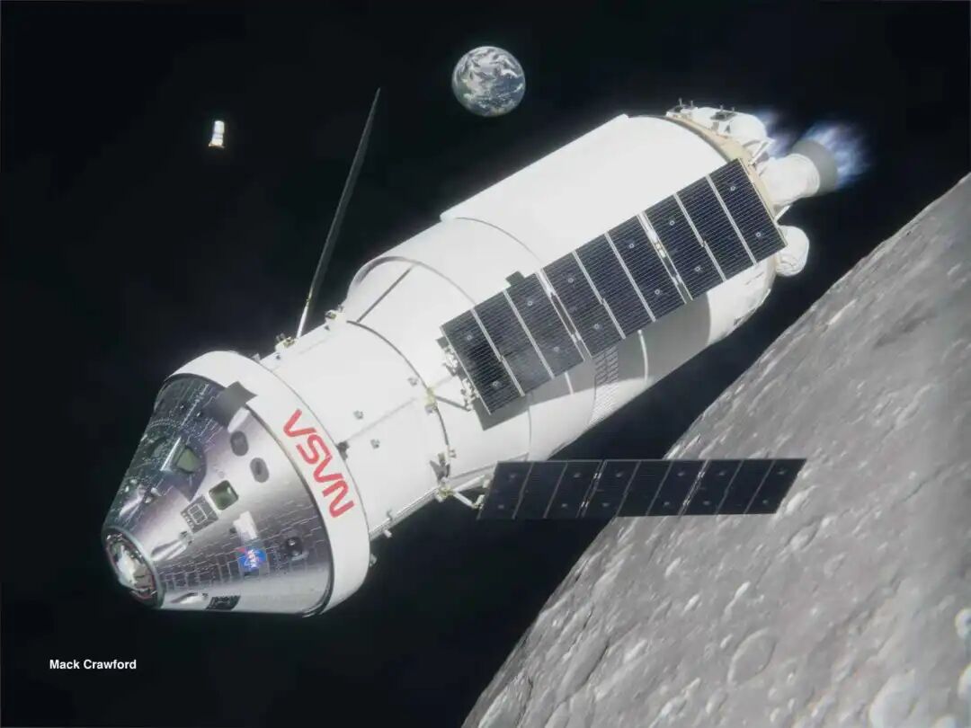 半人马Ⅴ上面级和猎户座飞船组合体飞过月面的CG渲染图,这样的场面什么时候能够成真,还说不好 | Mack Crawford