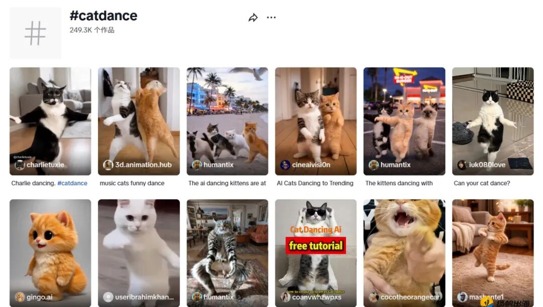 除了萌娃,火起来的还有跳舞的萌宠。TikTok平台话题#catdance之下的相关视频,也达到了24.9万个,并且仍处于增长态势。但不管是萌娃还是萌宠,这类AI跳舞内容有明显共性:通过幼态、“萌系”形象与成熟舞蹈动作之间的反差,叠加音乐节奏,使其天然适配短视频传播。
