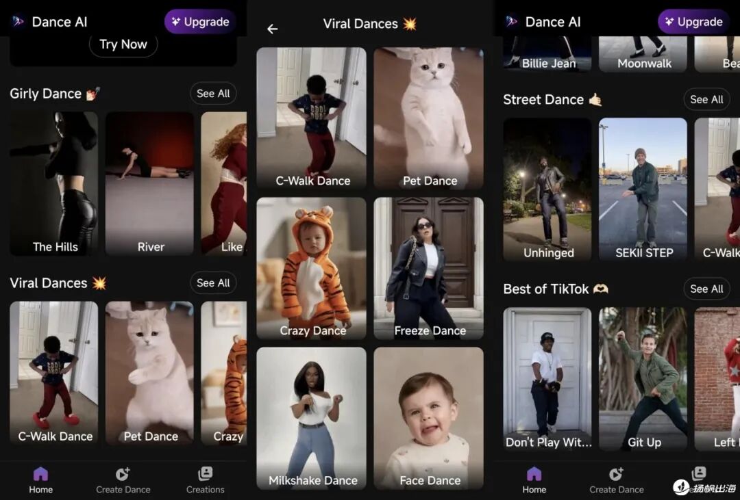 首先,Dance AI起量的核心之一,在于它更直接地对准了用户的最终使用场景。对于大多数用户而言,制作AI舞蹈视频的目的并不是“生成”本身,而是用于社交平台传播。因此,在产品设计上,其首页直接呈现大量已经被验证过的热门模板与用户感兴趣的舞蹈种类,包括萌娃、萌宠跳舞视频,爵士舞、街舞、K-pop舞蹈等,并按照内容风格进行分类。