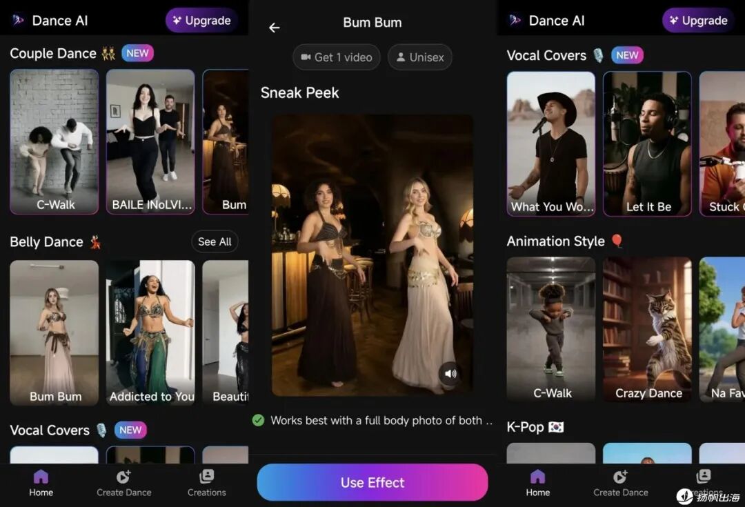 同时,Dance AI也在持续补充新的热门模板,例如双人舞蹈、唱歌等模板。根据应用商店描述,其模板库会持续加入“热门舞蹈与流行内容”,以保证用户始终可以“走在潮流前列”。