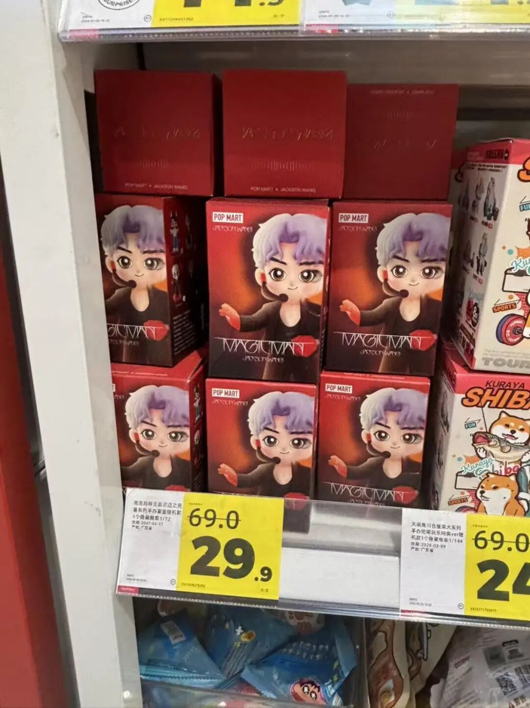 当赵一鸣联合代工厂和版权方,试图打造一个“9.9元抽万物”的潮玩宇宙时,另一边的折扣巨头好特卖,也开始在货架上“乱卖”:从泡泡玛特盲盒,到透卡、立牌这些“二次元年货”,这些谷子潮玩在过季之后流入不同门店,被打上直接半价甚至三折的标签,硬是催生出了一批“代购”。