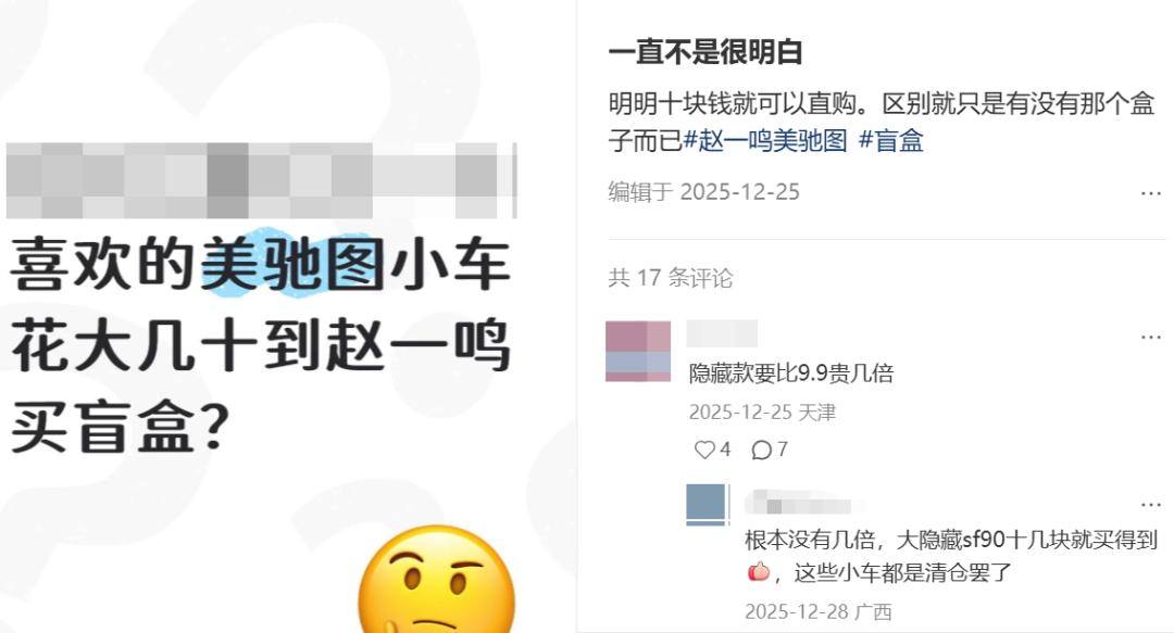 去年年底,赵一鸣引入了美驰图的1:64法拉利盲盒(内盒为与美驰图同属香港美昌集团,拥有法拉利车模授权的比美高),售价9.9元,当时便小火一把。