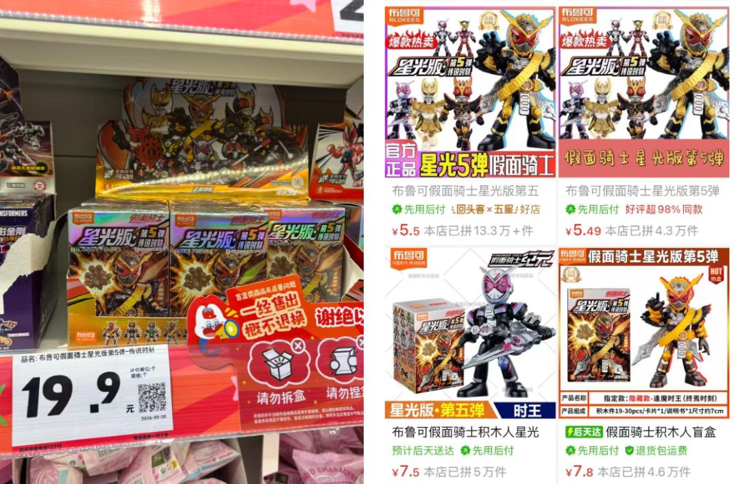 例如,好想来售卖的布鲁可假面骑士星光版盲盒单盒标价19.9元,虽然低于39元的首发价格,但该款在线上渠道的价格早已铺至7-15元。“线下肯定要赚一点,即使是15元我可能都会路过拆一个,但这个价格就没必要了。”相关爱好者告诉剁椒,“放这里就不是为了吸引人进来的,而是让价格不敏感的家长和零食一起买给小孩,这个货架和普通超市的玩具货架没什么区别。”