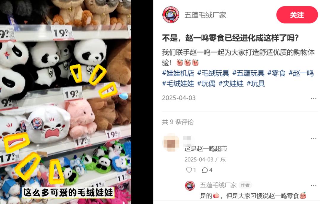 此外,还有部分较大的赵一鸣门店上线了一些价格在10-20元之间的毛绒玩具。在桑尼森迪冲刺IPO后,不少代工厂都看到了借由量贩零售渠道打造爆品,从“白牌”转型潮玩的机会,“与赵一鸣合作”成为了它们品牌化转型的最好标签。
