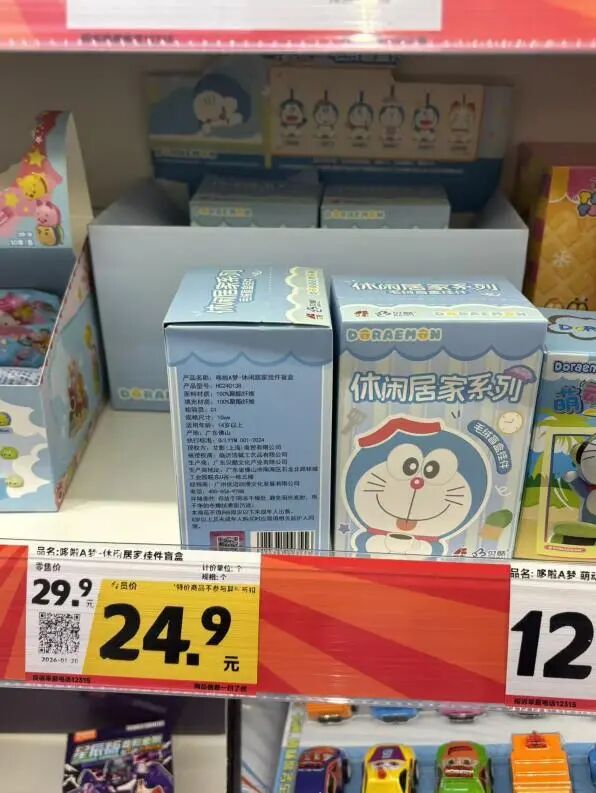 想要在好想来相对划算地买到潮玩,需要配合“会员价”和“每周会员日88折”的限制,但在这个货架上,带有会员专属折扣的黄色标签的产品也不过两件。例如,某玩具厂家的“哆啦a梦休闲居家盲盒”的原价和会员价便有5元的差异。