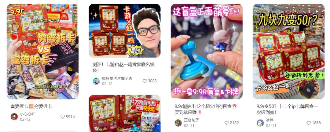 春节期间,赵一鸣更是打出“万物皆可抽,只要9.9元”的口号,推出了与卡游合作的新春福袋,包含12款IP,引来无数博主测评。