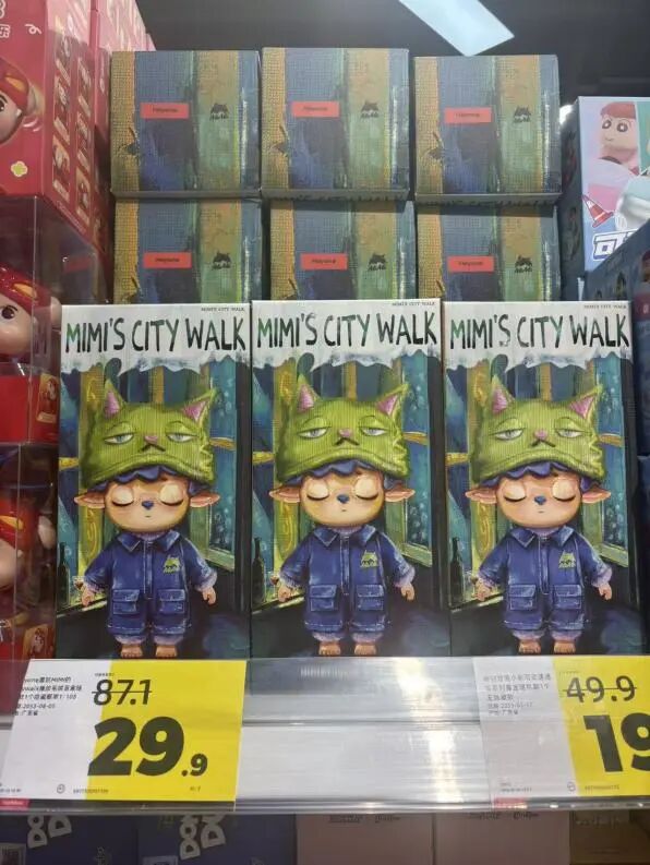 遇到部分门店清库存,还能折上折:在北京某好特卖门店,黑玩“mimi的citywalk”系列首发99元,标价从87.1元划线降到29.9元;52TOYS的“sleep东方绘卷”系列官价79元,在47.3元的渠道价之上再次降到19.9元。