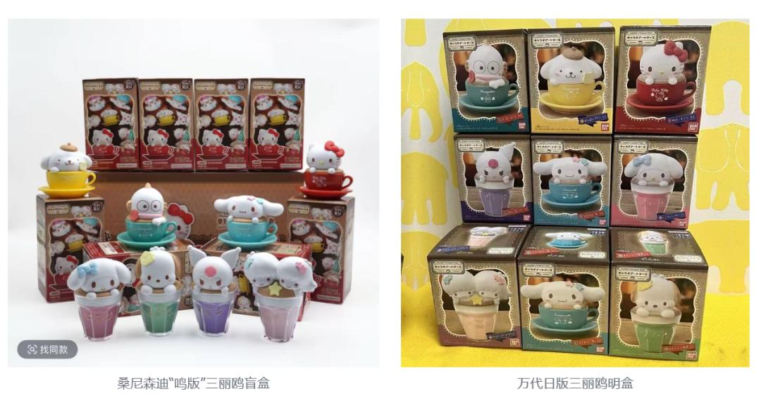 但存在感最强的,仍然是赵一鸣自行与代工厂合作,取得IP授权后推出的独家产品——除了高达明盒,桑尼森迪还曾为赵一鸣生产过一款“鸣版”三丽鸥拿铁主题盲盒。这套盲盒的造型和日本万代食玩取得三丽鸥授权后生产的明盒接近,后者主要在海外销售,价格在35-50元之间。