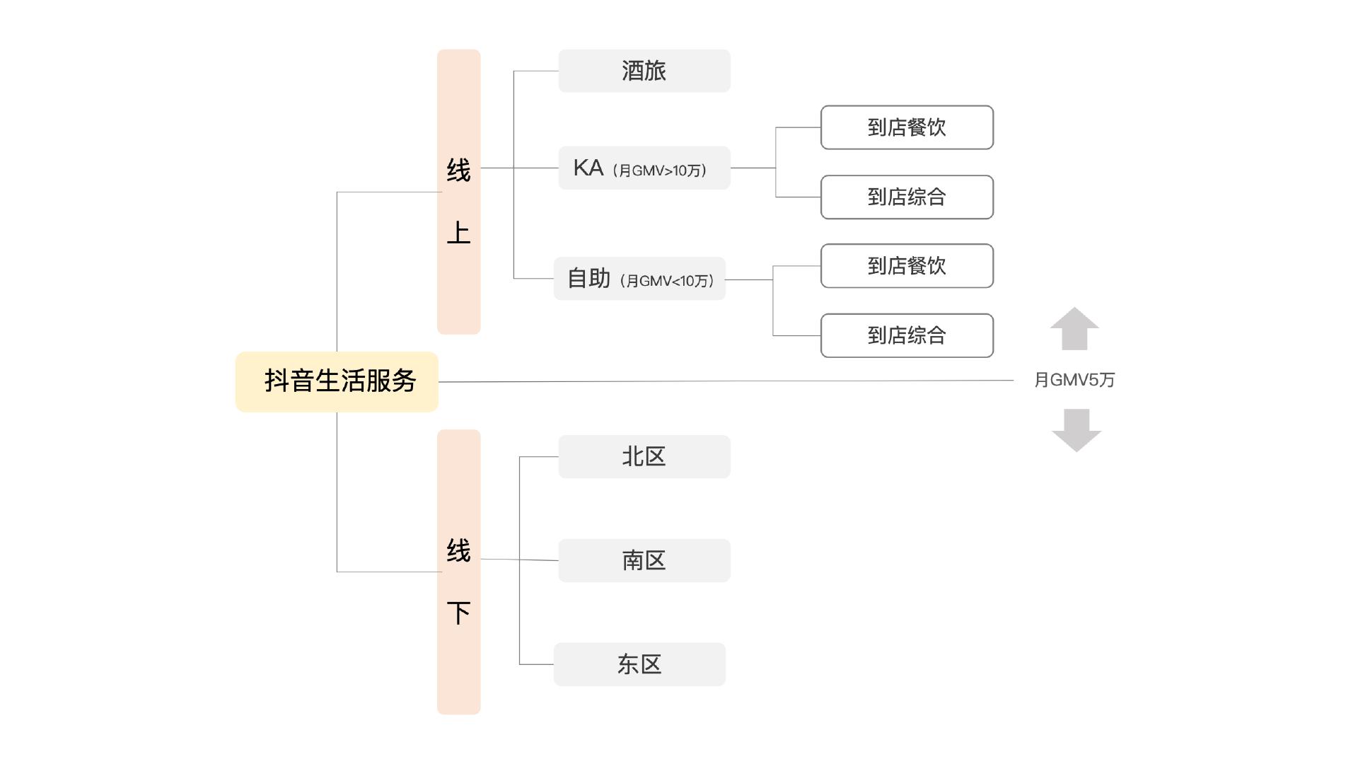 月GMV5万以上的客户被放到线上部门,分为KA(月GMV10万以上)、自助(月GMV在5-10万)、酒旅三个版块。其中前二者又分别按行业细分为餐饮、到店综合。