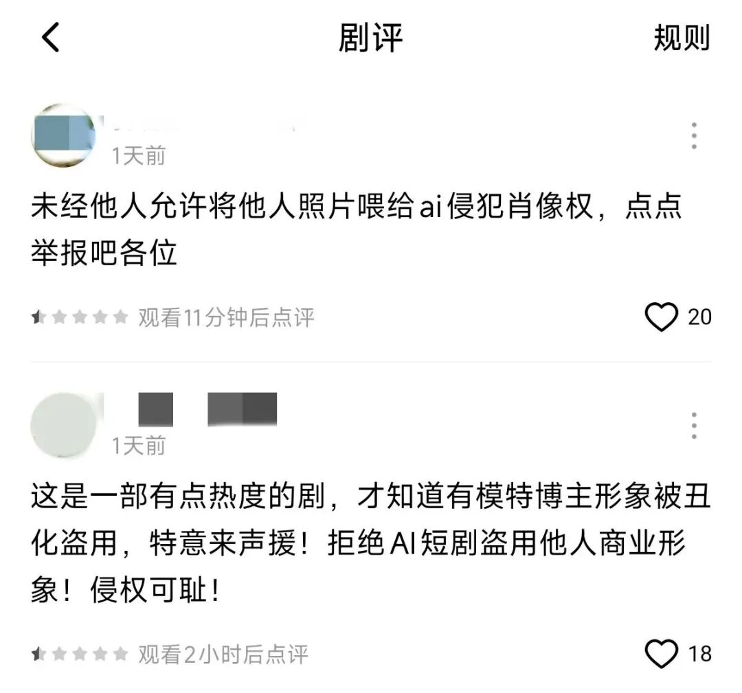 从剧评来看,该短剧剧情和AI制作技术确实大受欢迎,但评论区众多网友也纷纷谴责制作方盗用他人人脸的行为,有网友甚至用“AI偷脸,赶紧凉吧”表达愤怒。