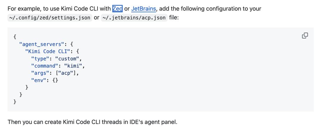 除此之外,我们通过 ACP 模式提供 ACP 服务端(同样走 stdio 通信),支持接入任何 ACP 客户端,这使得 Kimi CLI 可以接入 JetBrains 和 Zed 等 IDE,也可以接入 DeepChat、Alma 这样的本地通用 agent 客户端。