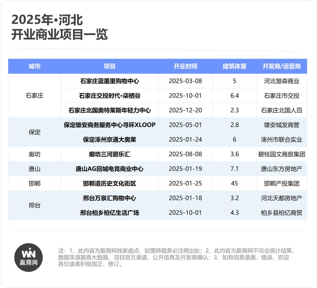 2025年是河北商业夯实基础的关键一年,全省新开集中式商业项目覆盖石家庄、保定、廊坊、唐山、邯郸、邢台六城,项目布局紧扣区域发展节奏与消费需求,呈现出四大鲜明特征。