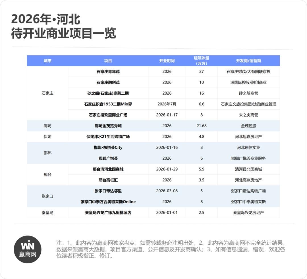 ■ 2026年,14个待开项目、超130万㎡商业体量蓄势待发,大体量标杆、全国性运营商、奥莱矩阵、文商旅融合项目集中亮相,标志着河北商业在夯实民生底盘的基础上,正式迈向品质升级与格局重塑的新阶段。