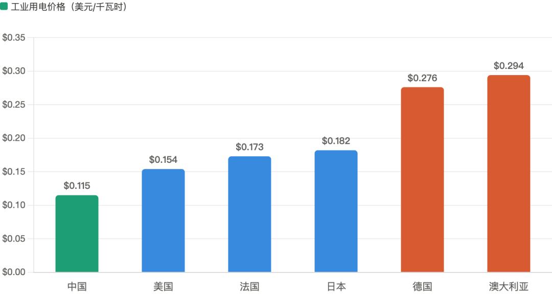 这种差异已经能在公开电价中看到。按 2025 年第三季度的公开口径,中国工业用电价格约为每千瓦时 0.115 美元,美国约 0.154 美元,德国约 0.276 美元。这个口径并不完全等同于数据中心最终到手电价,但足以说明方向:中国仍处在主要经济体的低位区间。