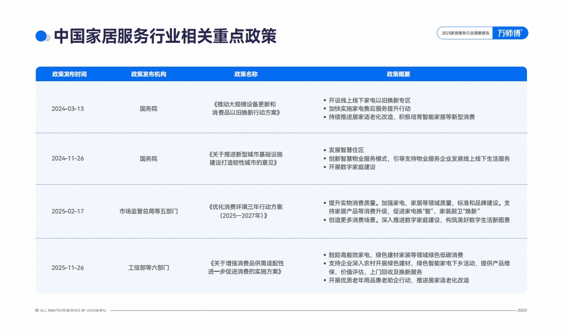 3月30日,万师傅发布《2025家居服务行业洞察报告》(下称“报告”),聚焦家居服务行业,从宏观环境、中观行业、微观供需侧等视角出发,通过市场调研、消费者回访、企业调研、服务者洞察等方式,全面剖析家居市场需求变化,探索行业发展趋势。