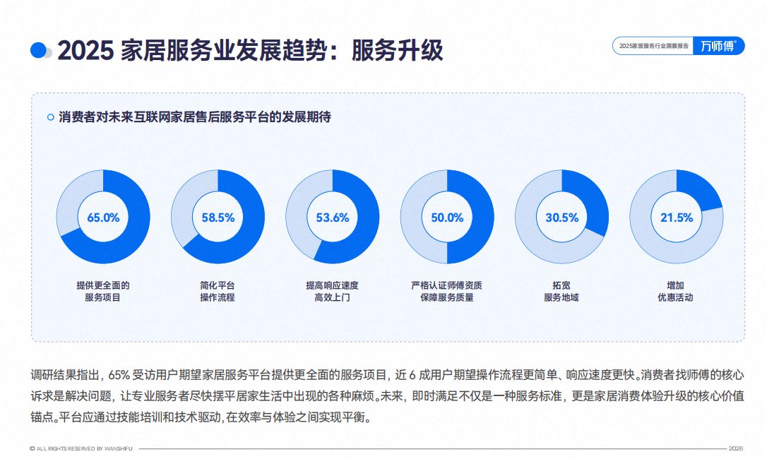 服务行业的核心价值在于服务本身,消费者找师傅是为了解决问题。调研结果指出,65%受访用户期望家居服务平台提供更全面的服务项目。