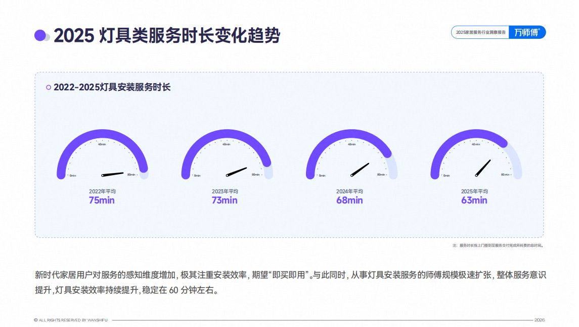 与此同时,从事灯具安装服务的师傅规模极速扩张,整体服务意识提升,灯具安装效率持续提升,稳定在60分钟左右。当今家居用户对服务的感知维度增加,极其注重安装效率,期望“即买即用”。