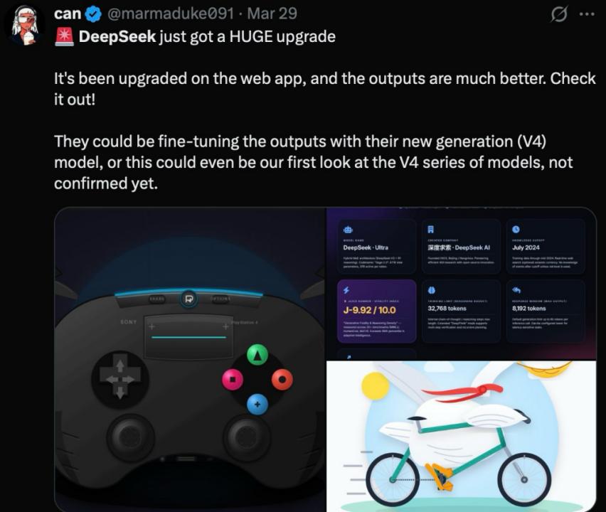 翻译过来,大概的意思就是:网页和APP端上,DeepSeek模型可能已经再次更新。现在,这个模型似乎始终将其自身标识为V3版本。做了一些测试,发现零提示能力大涨,输出的风格和几天前不太一样。但还需要进行更多测试才能完全确定结论。