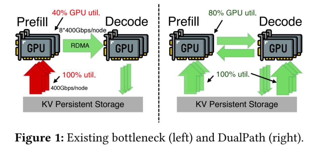 模型练好了,大脑也变聪明了,当它作为Agent去处理几十万字的长文本和多轮代码任务时,会产生海量的上下文缓存(KV-Cache)。这时候计算不再是瓶颈,“读取硬盘数据到显卡”的 I/O 带宽成了瓶颈。DualPath巧妙地调用了集群中原本闲置的解码节点(Decode)的网卡,去帮预填充节点(Prefill)搬运数据,让端到端的吞吐量暴增近2倍。