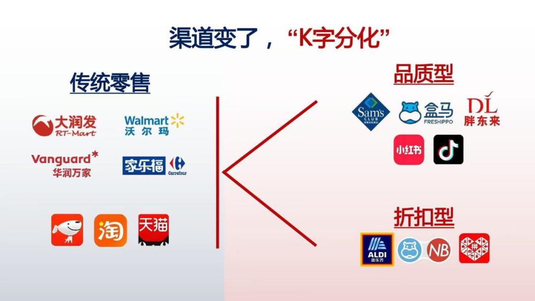 渠道的K型分化:在北京上海这样的高线城市,现在人们愿意专门驱车前往山姆、盒马。中线城市的胖东来,提供了更好品质、独特体验和惊喜感。同时,奥乐齐、盒马NB等折扣店,以7折甚至5折的价格提供品质相当的商品。在长沙、常德等城市,零食很忙、赵一鸣等零食店以六七折的价格开遍大街小巷。在线上平台购物同样如此:追求品质去小红书、抖音,追求实惠上拼多多。这就是典型的 “K字形”分化——消费者要么去找到更好品质的商品,要么去找更便宜的商品。