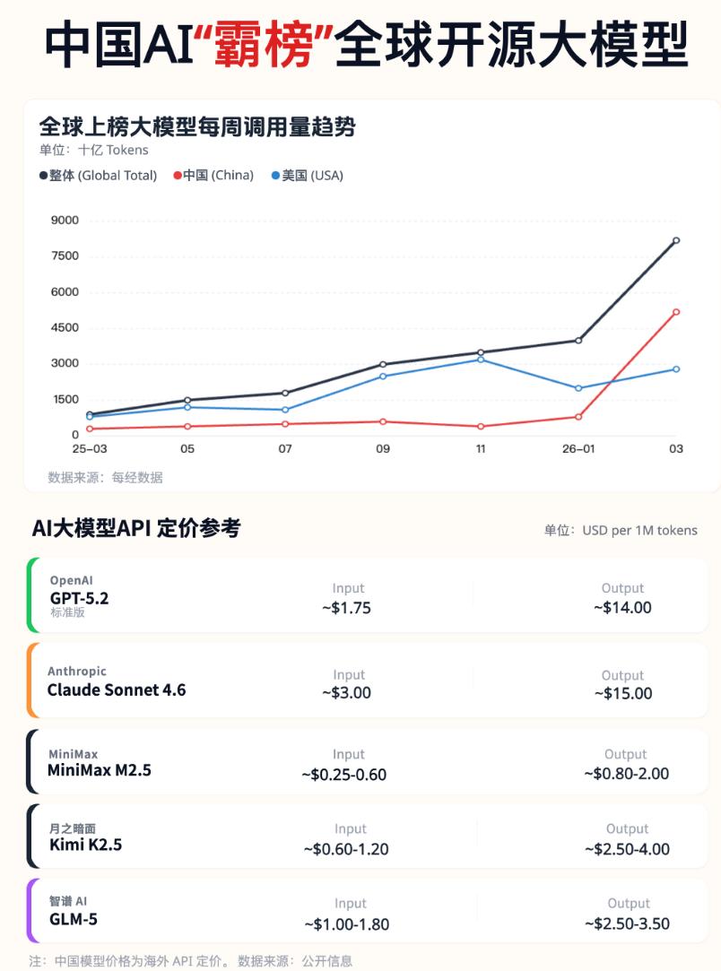同样是写代码的任务,美国模型Claude Opus 4.6要5美元/百万Token,而中国MiniMax M2.5、智谱GLM-5只要0.3美元,差了16倍不止。