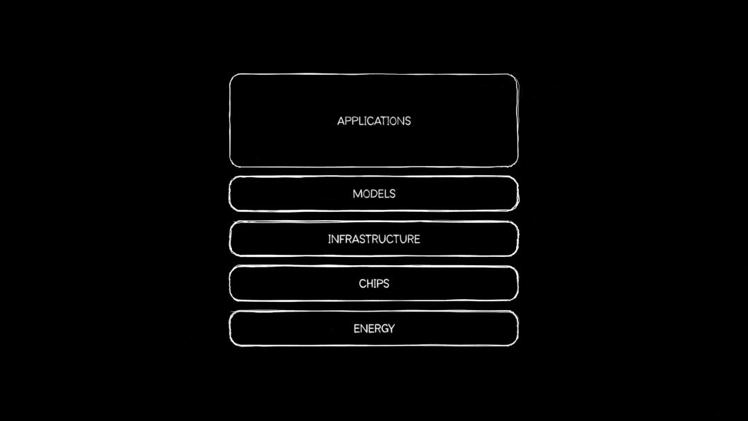 文中提出了AI产业的 「五层蛋糕」 模型,将AI拆成了能源、芯片、基础设施、模型、应用,五个层面,并反复强调:每个成功的应用,都会向下拉动它下面所有层,一直延伸到维持它运转的发电厂。
