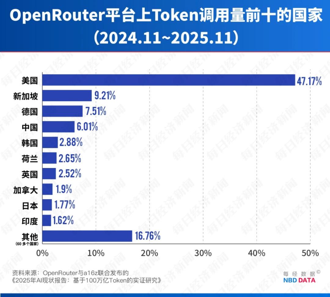 全球AI模型聚合平台OpenRouter显示,今年2月中旬开始,中国模型的调用量已超过美国,美国用户占比高达47%,越来越多的海外开发者开始批量调用中国大模型的API。