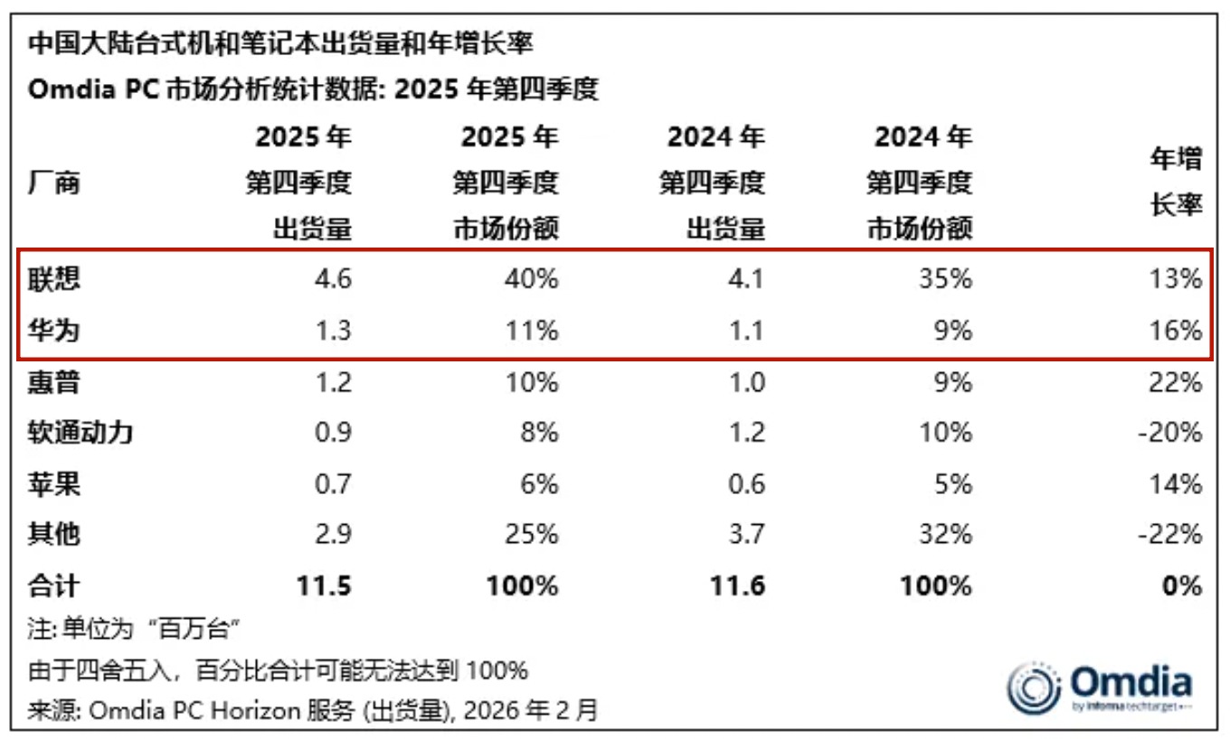 2025年第四季度则是华为增速再次超过联想。尽管从整体份额来看,华为11%的份额距离联想40%的成绩仍有较大距离,但华为已超越惠普,成为联想在国内PC市场最核心的竞争对手。