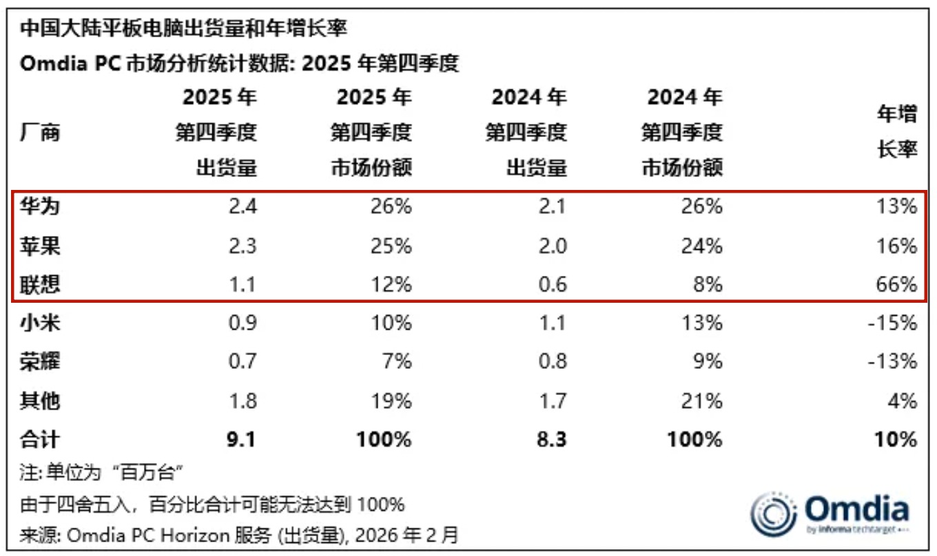 Omdia的最新报告还包括平板数据。2025年第四季度,中国平板电脑出货910万台,同比增长10%,显著好于PC市场表现。华为以240万台、26%份额位居第一,苹果以230万台、25%的市场份额紧随其后,形成双寡头格局。