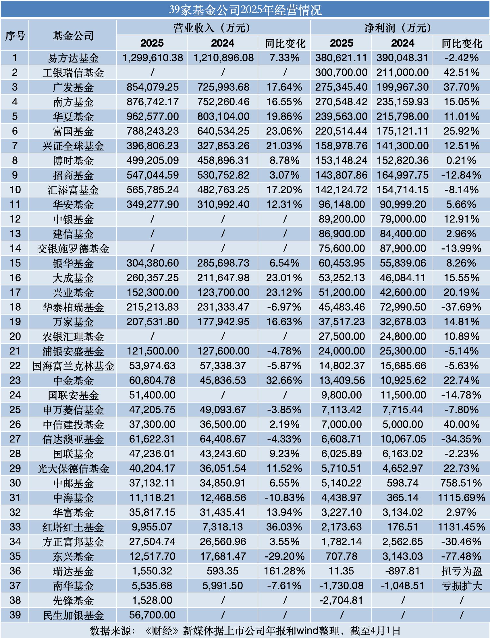 据《财经》新媒体不完全统计,截至4月1日,至少有39家基金公司(不含券商资管)2025年经营数据出炉。