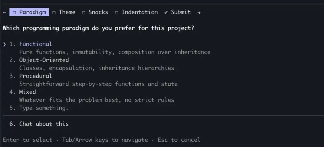 最后,我们决定创建一个 Claude 可以在任何时候调用的工具,但特别提示在计划模式期间这样做。当工具触发时,我们会显示一个模态框来显示问题,并阻止智能体的循环直到用户回答。