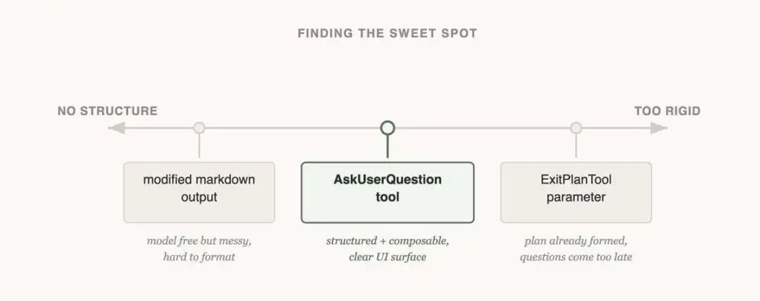 我们首先尝试的是向 ExitPlanTool 添加一个参数,以便在计划旁边放置一系列问题。这是最容易实现的事情,但这让 Claude 感到困惑,因为我们同时要求制定一个计划,并提出一系列关于计划的问题。如果用户的回答与计划内容相冲突怎么办?Claude 需要调用 ExitPlanTool 两次吗?我们需要另一种方法。