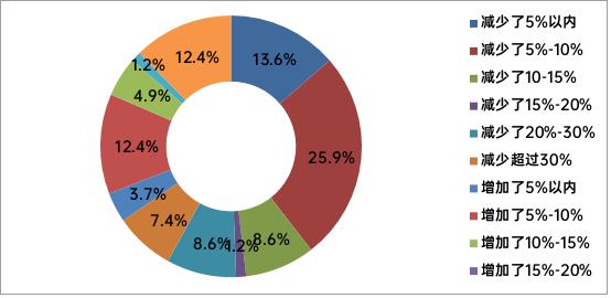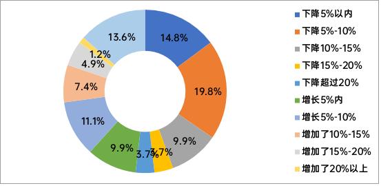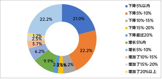 从下滑幅度分布来看,净利润下滑呈现中等幅度下滑为主,全区间普遍承压的特征。其中,净利润减少5%-10%的企业占比高达25.9%,是所有选项中占比最高的,即近三成企业出现了中等幅度的盈利下滑;净利润减少5%以内的企业占比13.6%,减少5%-10%的企业占比25.9%,两大区间合计占比39.5%。而下滑幅度超过20%的企业合计占比16%,其中减少20%-30%的企业占比8.6%,减少超过30%的企业占比7.4%,盈利大幅滑坡的企业占比同样高于销售端同区间的占比。