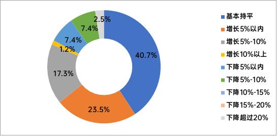 从增长企业来看,实现销售增长的企业不仅数量少,幅度也普遍偏低。在32%实现销售额增长的企业中,增长5%以内的企业占比18.5%,占增长阵营的近六成;增长5%-10%的企业仅占4.9%,增长10%-15%的企业占6.2%,增长15%-20%与增长20%以上的企业均仅占1.2%。反映当前企业已经难以实现销售规模的跨越式增长,实现增长的企业,也大多停留在微增区间,行业整体增长遇到瓶颈。
