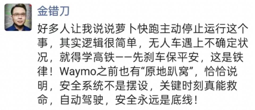 中国互联网商业观察家金错刀对此评论道:“无人车遇上不确定状况,就得学高铁——先刹车保平安,这是铁律!Waymo之前也有‘原地趴窝’,恰恰说明,安全系统不是摆设,关键时刻真能救命,自动驾驶,安全永远是底线!”