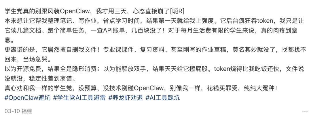 尽管市面上涌现了各种各样的龙虾智能体变体,消费者却并不因此轻易买单。不少用户吐槽:大部分龙虾智能体装上之后,根本没有什么实际效果;一个简单的任务就持续消耗token,还没跑完流程就已花掉几十块钱;想卸载时才发现入口隐藏极深,仿佛厂商生怕用户跑掉。