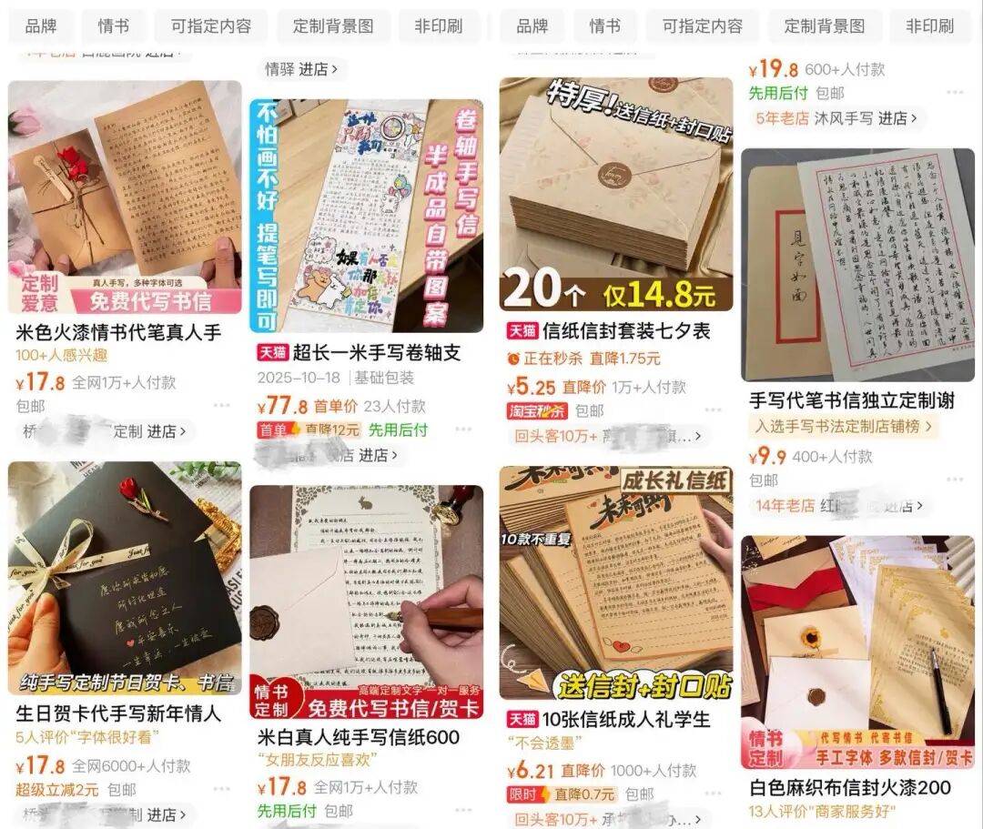 在淘宝,搜索“手写信定制”,有店铺月销量超过10000单;在抖音,搜索