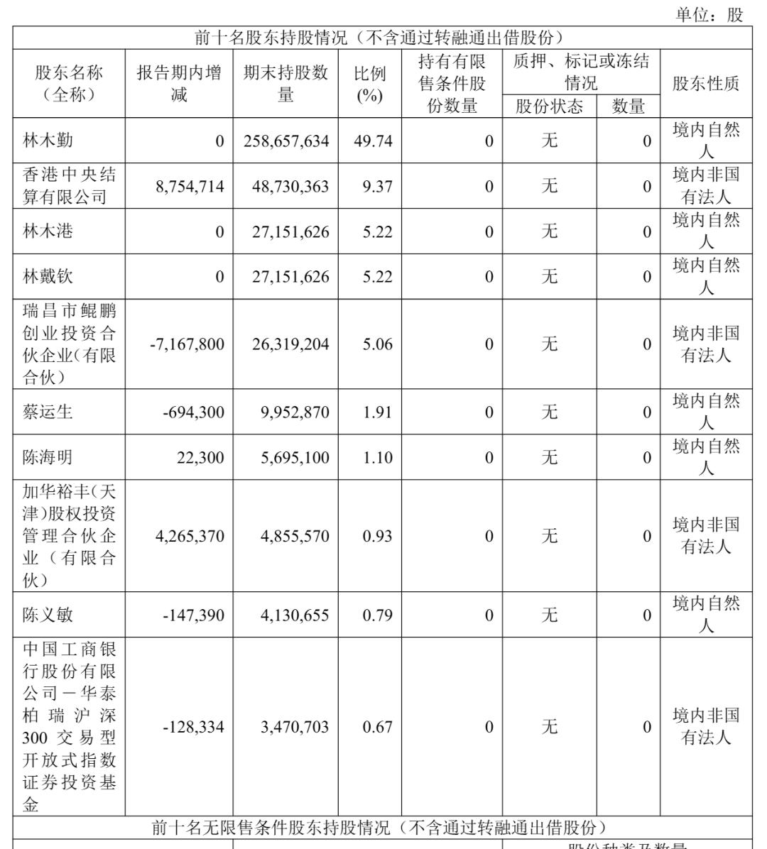 截至2025年12月31日,林木勤持股为49.74%,香港中央结算有限公司持股为9.37%,林木港、林戴钦分别持股为5.22%,瑞昌市鲲鹏创业投资合伙企业(有限合伙)持股为5.06%;