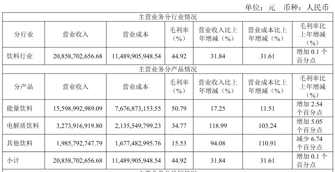 报告期内,公司的主营业务为饮料的研发、生产及销售。公司生产并对外销售的主要产品类别包括:能量饮料、电解质饮料、茶(类)饮料、咖啡(类)饮料、植物蛋白(类)饮料以及果蔬汁类饮料等。