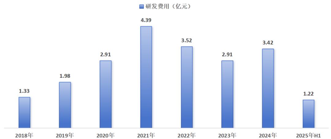 高昂的研发费用也是拖垮净利润的一大因素。为扭转产品劣势,蓝帆医疗在研发上投入巨大。2017年蓝帆医疗研发费用仅0.5亿元,而2024年则达3.42亿元。2018-2024年,蓝帆医疗的研发支出累计已超过20亿元,平均每年的支出金额为2.92亿元。