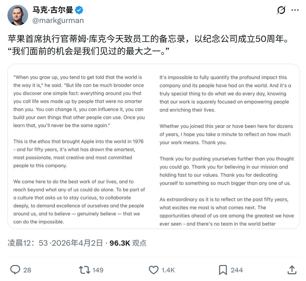 彭博社编辑马克·格尔曼(Mark·Gurman)在X平台曝光了库克发送给苹果员工的完整内部备忘录。信中,库克重温乔布斯改造世界的核心理念,强调苹果协作创新的企业文化,肯定数十年来全体员工的付出。他同时展望前路, “我们正迎来史上绝佳的发展机遇”,号召团队携手共创未来。