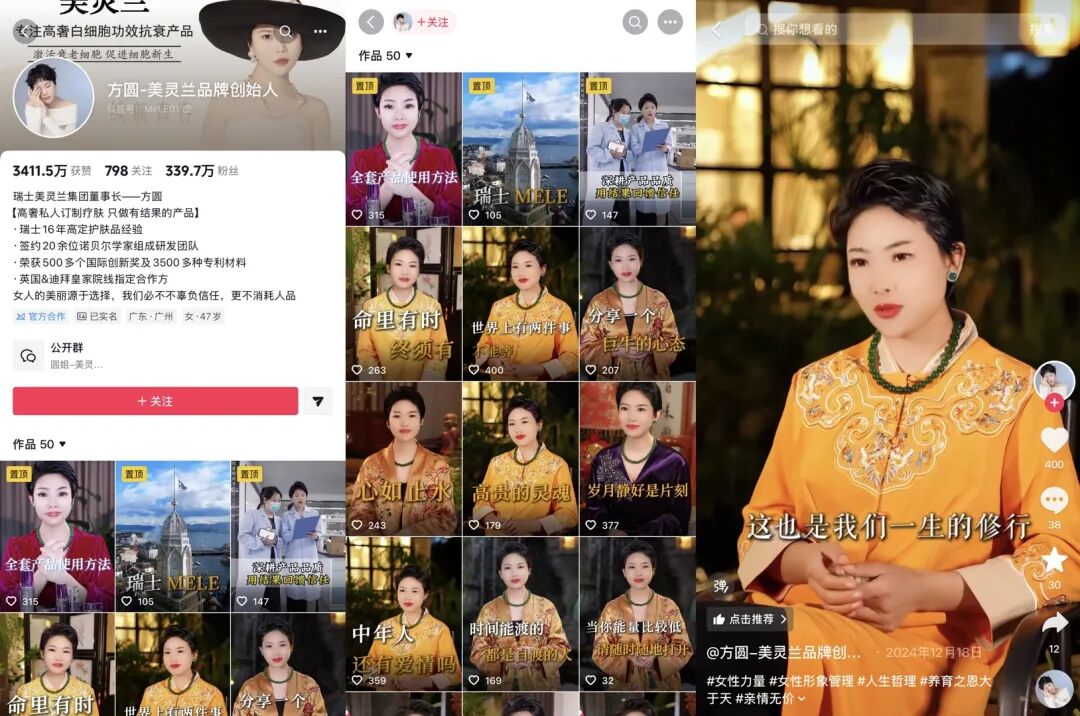 在抖音平台上搜索,发现有一个名为“方圆-美灵兰品牌创始人”的账号,该账号粉丝数339.7万,自称为瑞士美灵兰集团董事长,并签约20余位诺贝尔学家组成研发团队等,其视频风格侧重“女性形象管理”、“人生哲理”、“亲情无价”等。可以看到,其与前述怡姿兰创始人打造人设的套路相似。